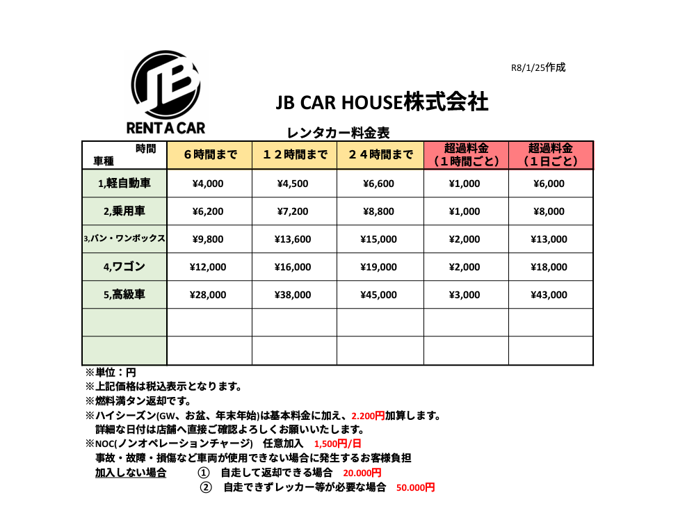 2026年レンタカー料金表